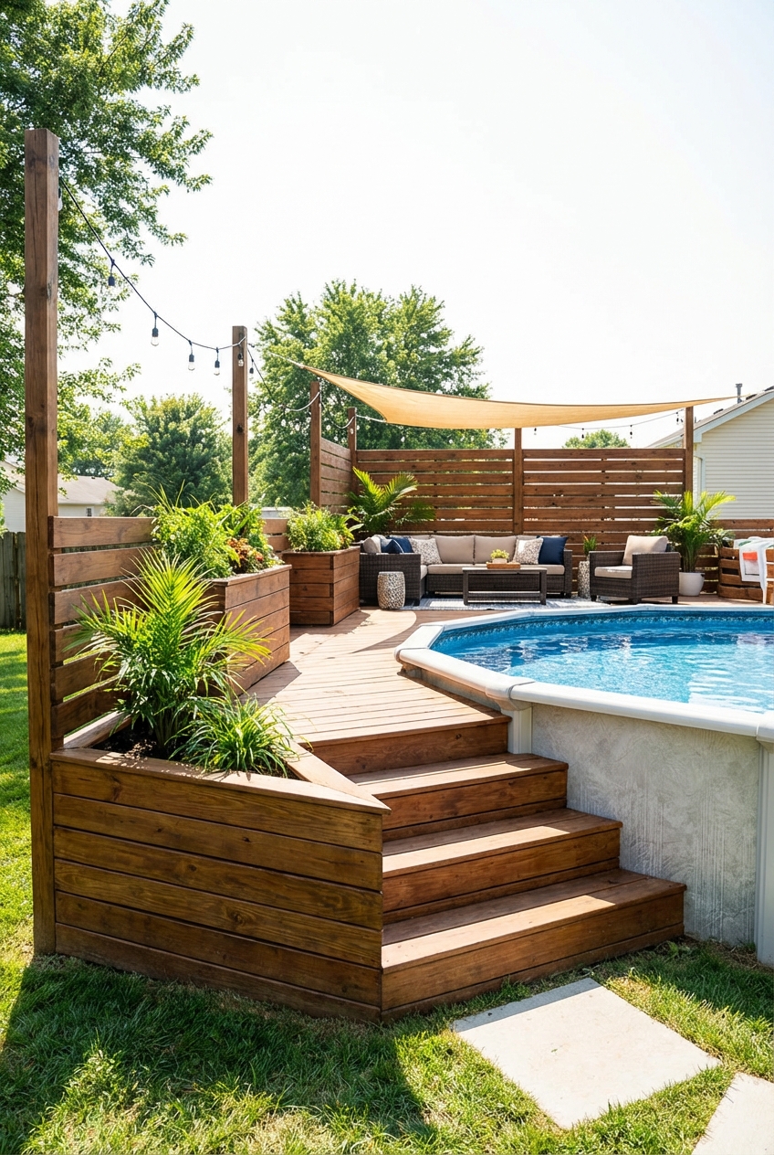 The Storage Corner: Every deck needs a place for “clutter.” Build a small, integrated bench with a lift-top lid. This provides extra seating and a place to hide pool chemicals, goggles, and toys when they aren’t in use.